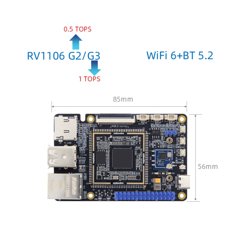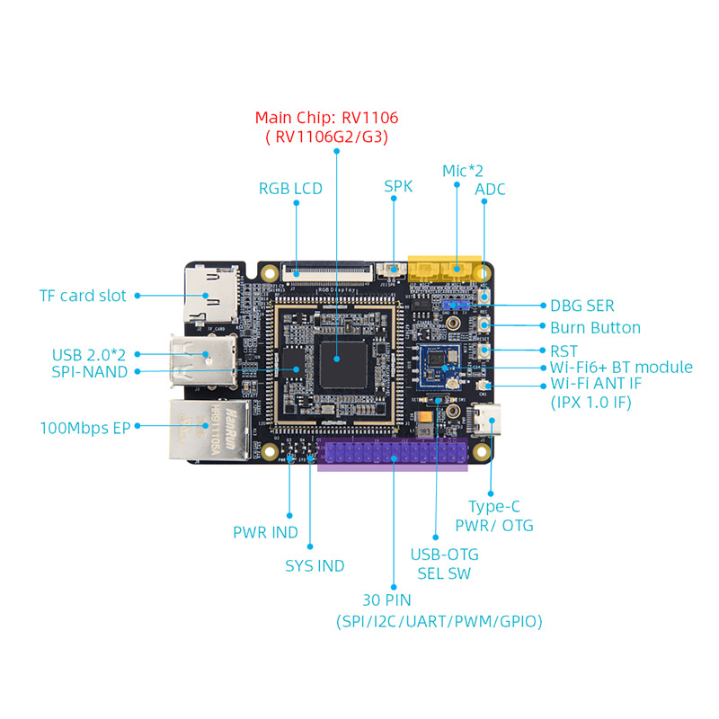 Bain úsáid as Rockchip RV1106 mar an phríomhshlis, le banda aonair WiFi6+BT5.2 Modúl Gan Sreang USB2.0 Óstach, 100m Ethernet, Sealbhóir Cárta TF, Ceamara MIPI, MIC, SPK agus forimeallaigh eile, Bioráin Chumraithe 30pin, Feidhmeanna Tacaíochta GPIO, SPI, I2C, UART, PWM.
